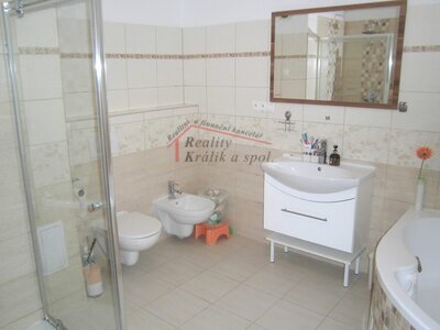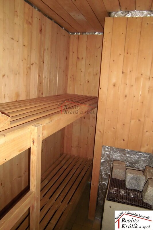 a zahradu, koupelna s rohovou vanou a sprchou, sauna, šatna , prostorná