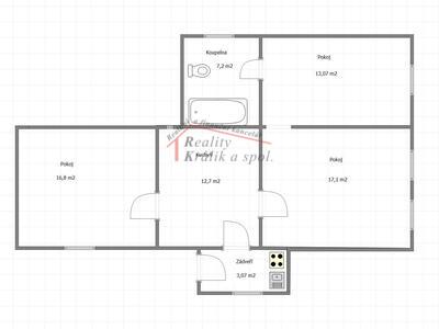 Dispozice obytné části: vstupní veranda, kuchyň, 3 pokoje, koupelna